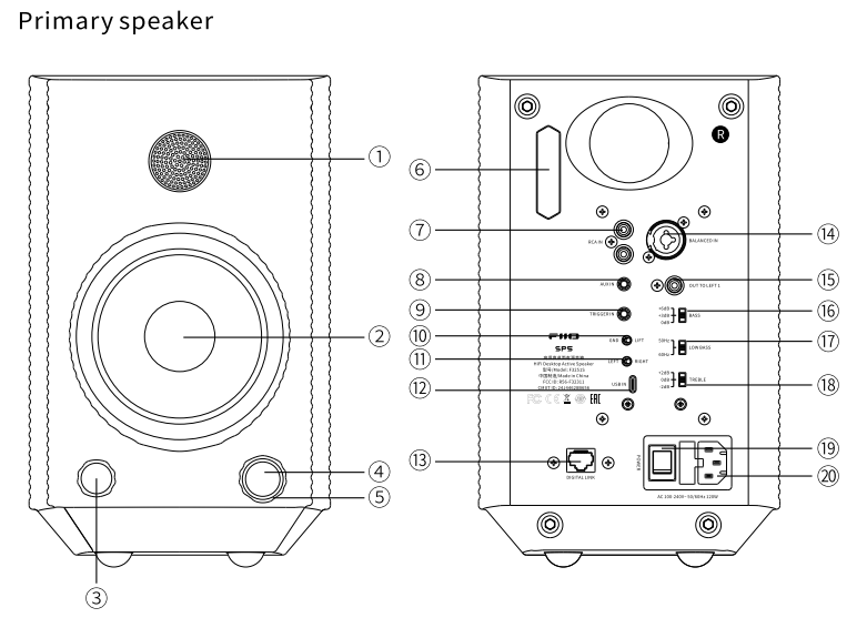 Power Off: While powered on, press and hold the encoder. The RGB light will turn off, and both the main and secondary speakers will enter standby mode. Then, turn off the power switches on the rear panel of both speakers to power them off simultaneously.