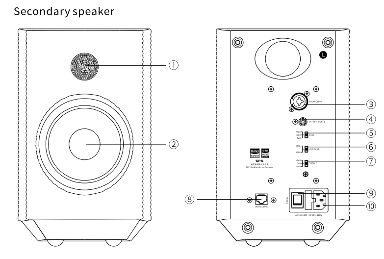 The master and slave speakers are equipped with a three-position toggle switch for treble adjustment: 0 / +2 / -2 dB.