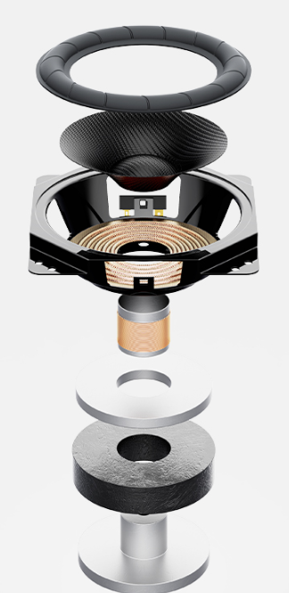 The cone is composed of a blend of carbon fiber, glass fiber, and other composite fibers, offering advantages such as fatigue resistance, corrosion resistance, and high modulus—making it an ideal material for sound transmission. To achieve satisfying acoustic performance, the cone is treated with a specialized sound-optimizing damping adhesive during production. This preserves sonic transparency, strikes a balance of rigidity and flexibility, delivers sweet vocal tones with rich detail, and ensures exceptionally responsive low-frequency performance.