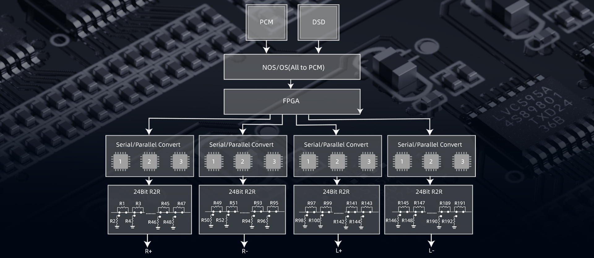 BR15 R2R搭载飞傲自研四路全差分互补24Bit R2R电阻阵列DAC,由每路48颗,四路总计192颗0.1%精度、低温漂(30ppm)的精密薄膜电阻构成,带来独具韵味的音质表现。还配备了NOS无过采样和OS过采样两种模式,带来不同聆听体验。