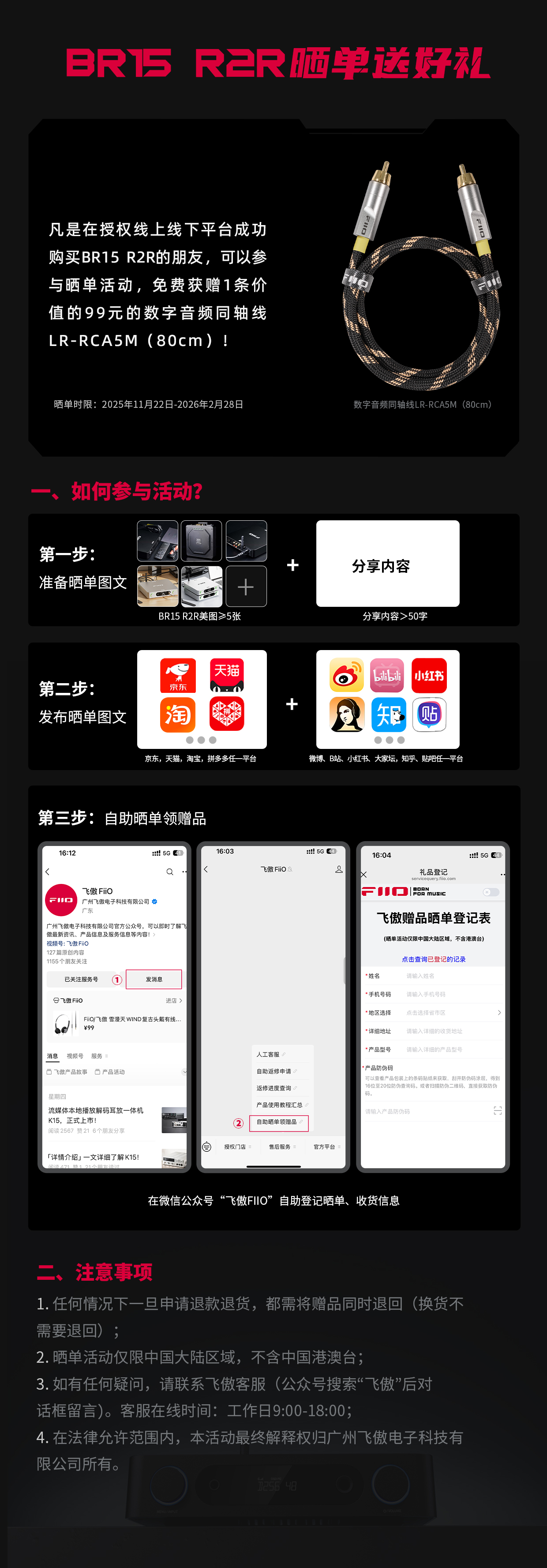 BR15 R2R官方售价1399元,将于11月10日开启预售!预售即送1条LL-OPT(100cm)光纤线。参与晒单活动送1条价值99元的LR-RCA5M(80cm)数字音频同轴线!