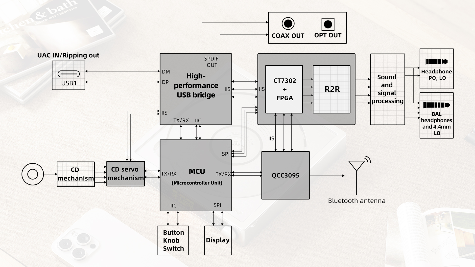 The DM15 R2R represents a breakthrough, combining a smaller footprint with an even stronger feature set. Packed into its portable chassis are five core pillars: the CD Servo, USB DAC, R2R Module, and Bluetooth Module, all managed and coordinated by an MCU (microcontroller unit). It integrates high performance and a wealth of features, single-ended output power increased by 66% to 310mW+310mW, and balanced output power increased by 74% to 1150mW+1150mW, making it a standout among its competitors.
