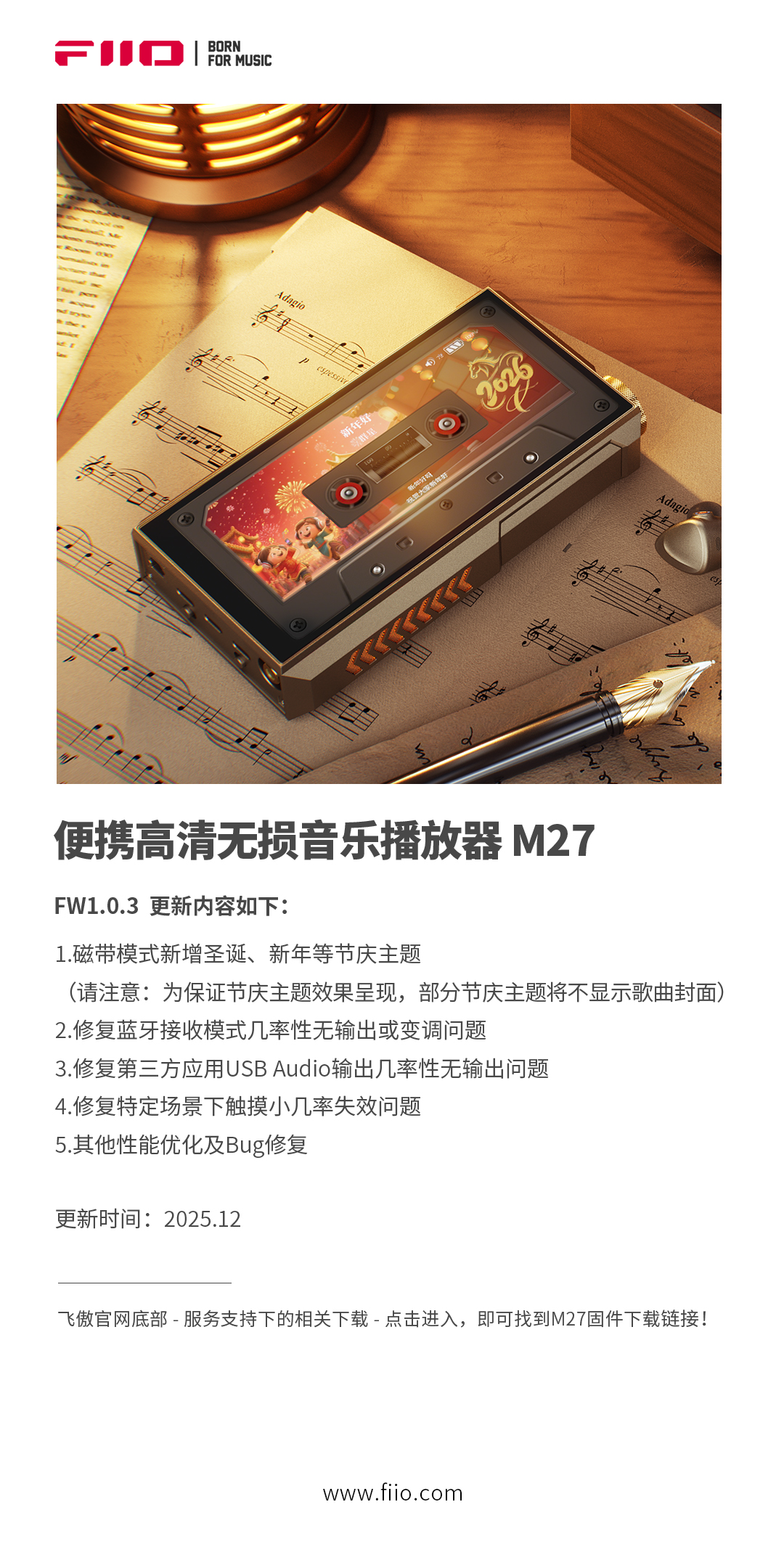 便携高清无损音乐播放器M27 FW1.0.3更新内容如下: 1.磁带模式新增圣诞、新年等节庆主题 (请注意:为保证节庆主题效果呈现,部分节庆主题将不显示歌曲封面 2.修复蓝牙接收模式几率性无输出或变调问题 3.修复第三方应用USB Audio输出几率性无输出问题 4.修复特定场景下触摸小几率失效问题 5.其他性能优化及Bug修复