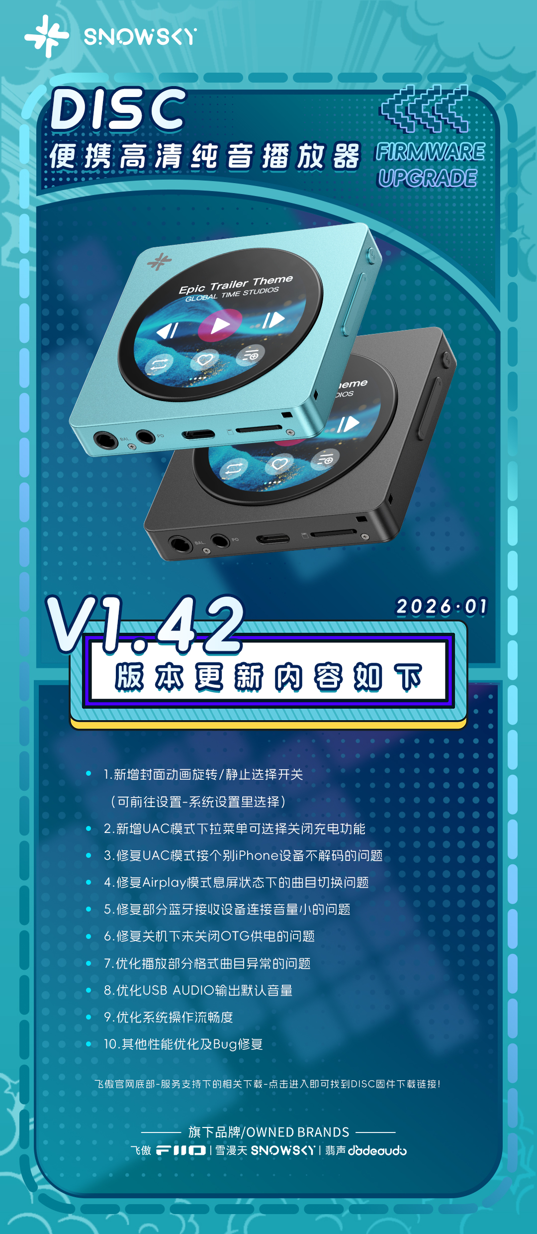 雪漫天DISC首次固件更新正式上线, 新增封面动画旋转 / 静止开关(设置 - 系统设置可调),UAC 模式支持关闭充电功能,满足你更多个性化使用需求。