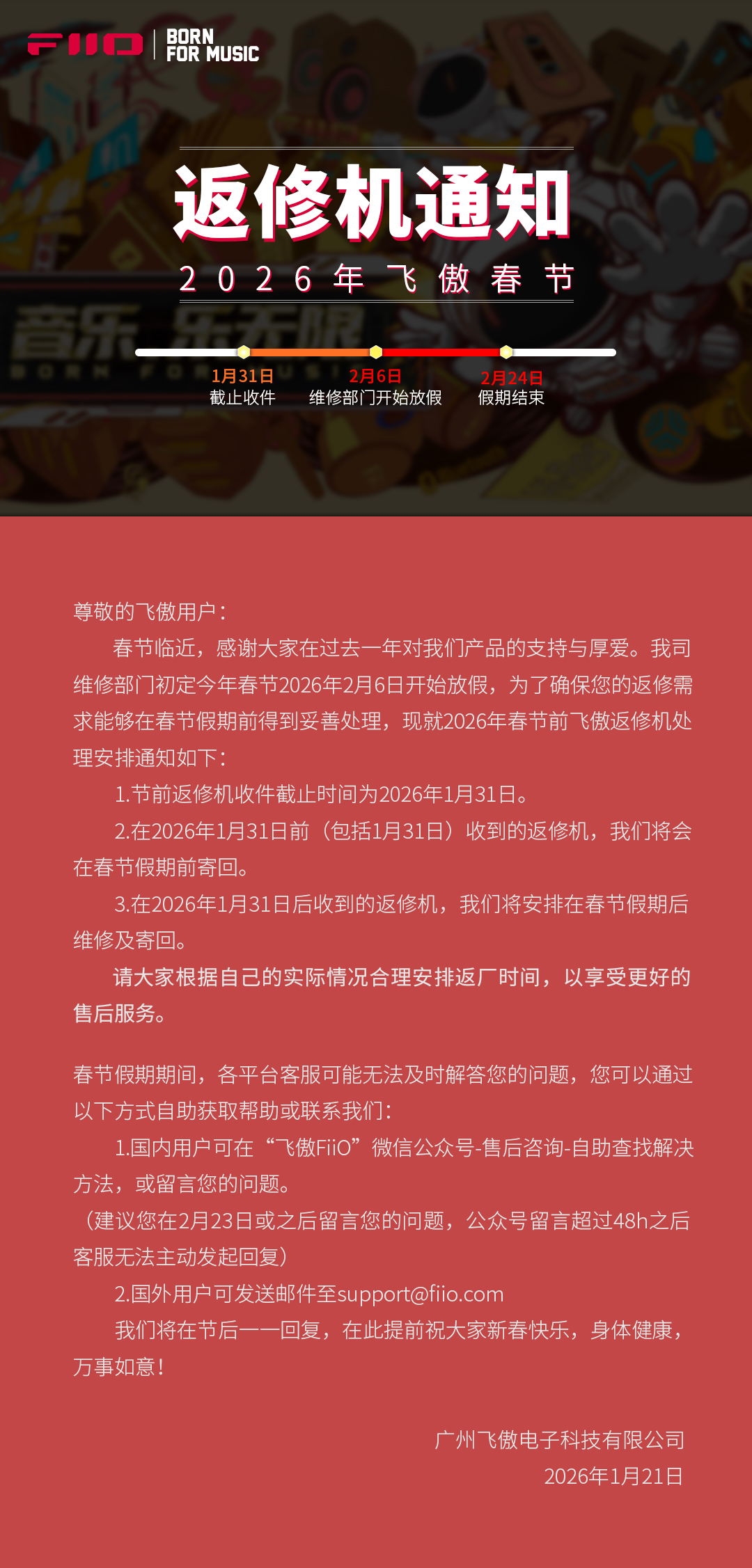 春节临近,感谢大家在过去一年对我们产品的支持与厚爱。我司维修部门初定今年春节2026年2月6日开始放假,为了确保您的返修需求能够在春节假期前得到妥善处理,现就2026年春节前飞傲返修机处理安排通知如下: