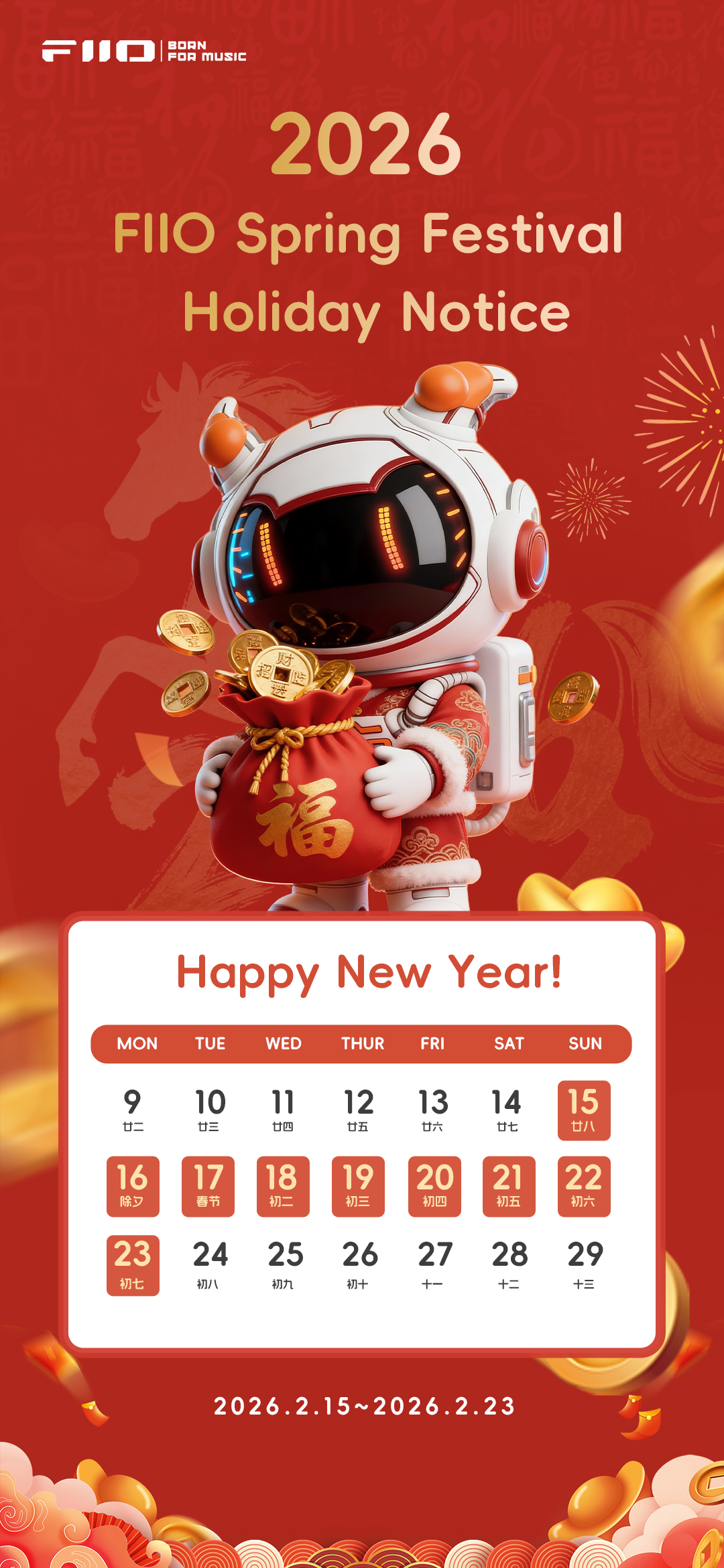 FIIO Holiday Schedule for 2026 Spring Festival