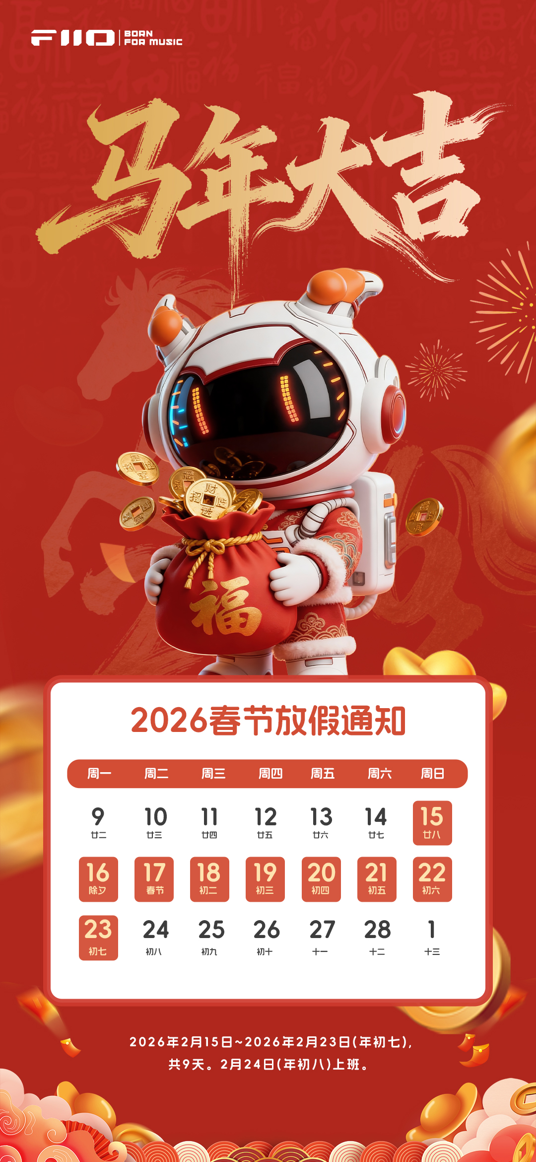 结合我司实际情况,春节放假时间为2026年2月15日至2026年2月23日,2026年2月24日(年初八)正式上班。放假期间,各平台客服可能无法及时解答您的问题,大家如有疑问可在微信公众号上自助查询或留言,我们将在节后一一回复。