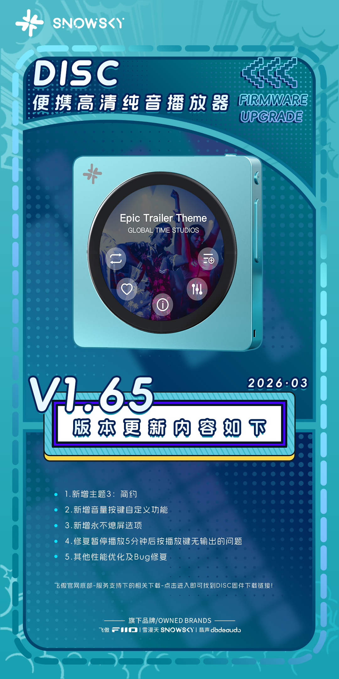 本次固件更新,新增音量按键自定义功能,常用操作一键直达,你的播放逻辑由你定义。同时带来全新简约主题,界面更干净,让目光专注音乐本身。此外新增永不熄屏选项,无论是专注聆听还是连接设备,屏幕状态尽在掌握。