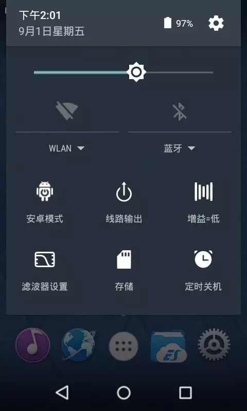 ▲drop-down menu, you can switch Android/pure tone mode, output mode and high and low gain with one key. Wi-Fi and Bluetooth functions can also be switched here.