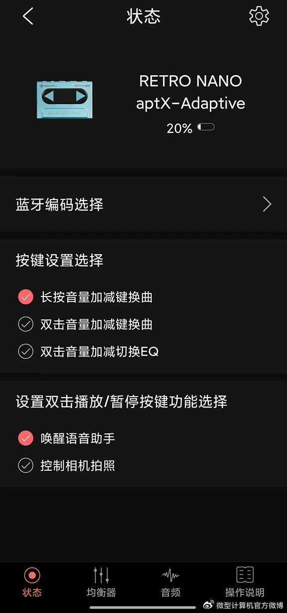 RETRO NANO具备3种工作模式——蓝牙(BT)、电脑(PC)和手机(PHONE),对应便携蓝牙耳放的3种应用场景:无线连接作为蓝牙解码耳放、有线连接电脑作为USB解码耳放以及有线连接手机作为USB“小尾巴”耳放。工作模式的切换方式多样,其中最为便捷的是通过双击多功能按键实现,用户也可以选择进入菜单进行模式选择。