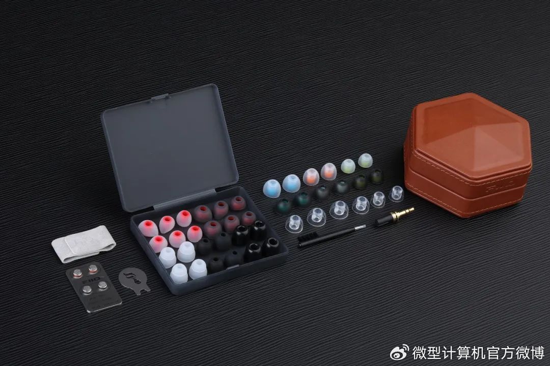 FH19的附件中提供了22对耳塞套,不仅涵盖海绵套、低频套、均衡套、人声套、SpinFit套、双节套和HS18等我们在以往飞傲耳机上碰到过的类型,还新增了液态硅胶耳机套HS20,大多数类型都提供了不同大小的3对,海绵套和双节套则是2对同样大小的。此外附件中还有磁吸线夹、插针清洁小毛刷和MMCX快拆片。FH19上搭配的HB7收纳盒不论是质感和设计都比较特别,六边形的盒子像一个精美的首饰盒,皮质面料带来不俗的质感,和FH19旗舰的身份很搭。