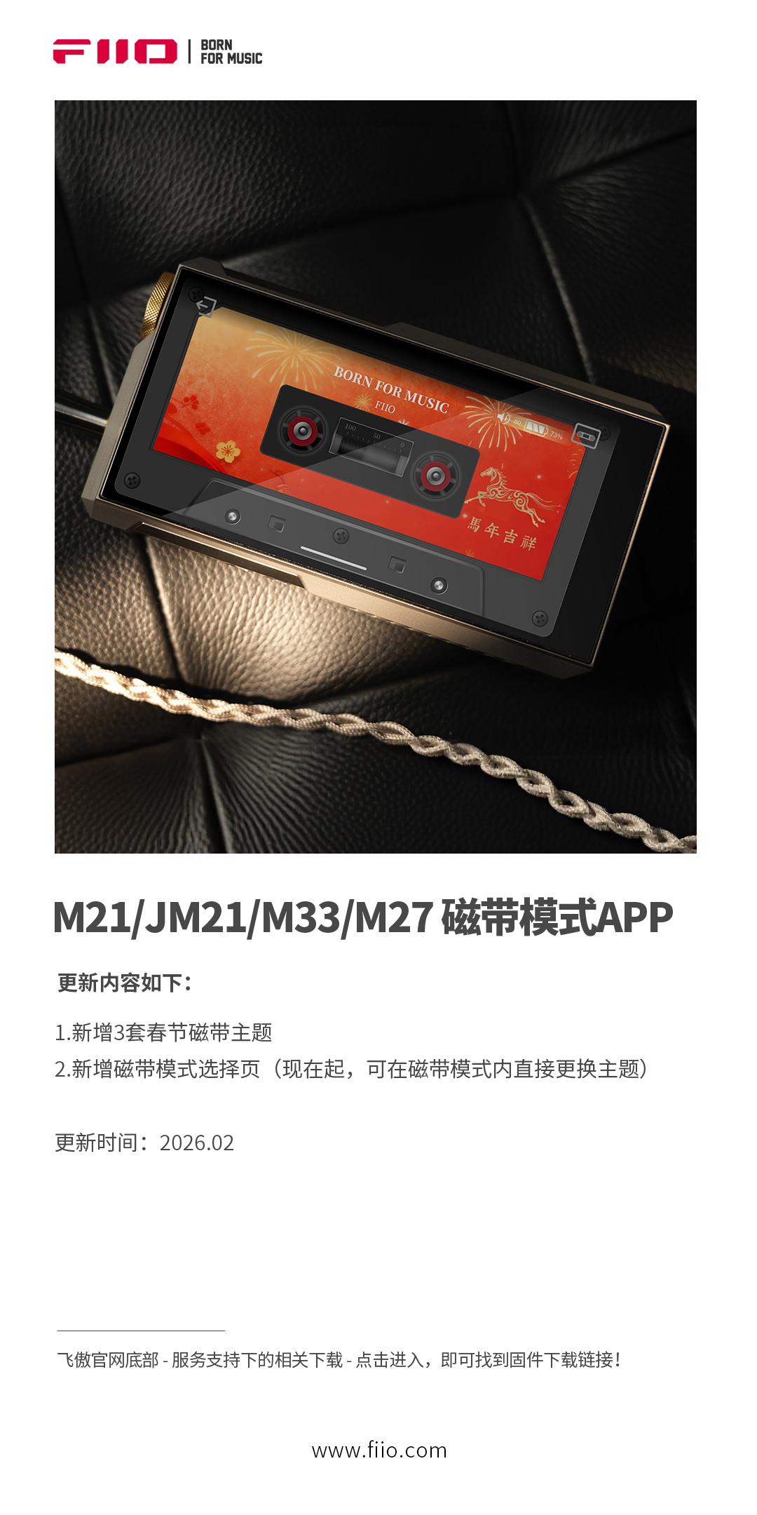 本次更新新增3套春节限定磁带主题,一键切换年味视觉,同时上线全新的 磁带模式选择页,在磁带模式里就能直接更换主题,无需退出返回设置,切换更顺手、玩法更丰富。M21/JM21/M33/M27用户们,播放器的春节“新皮肤”可以换起来了。