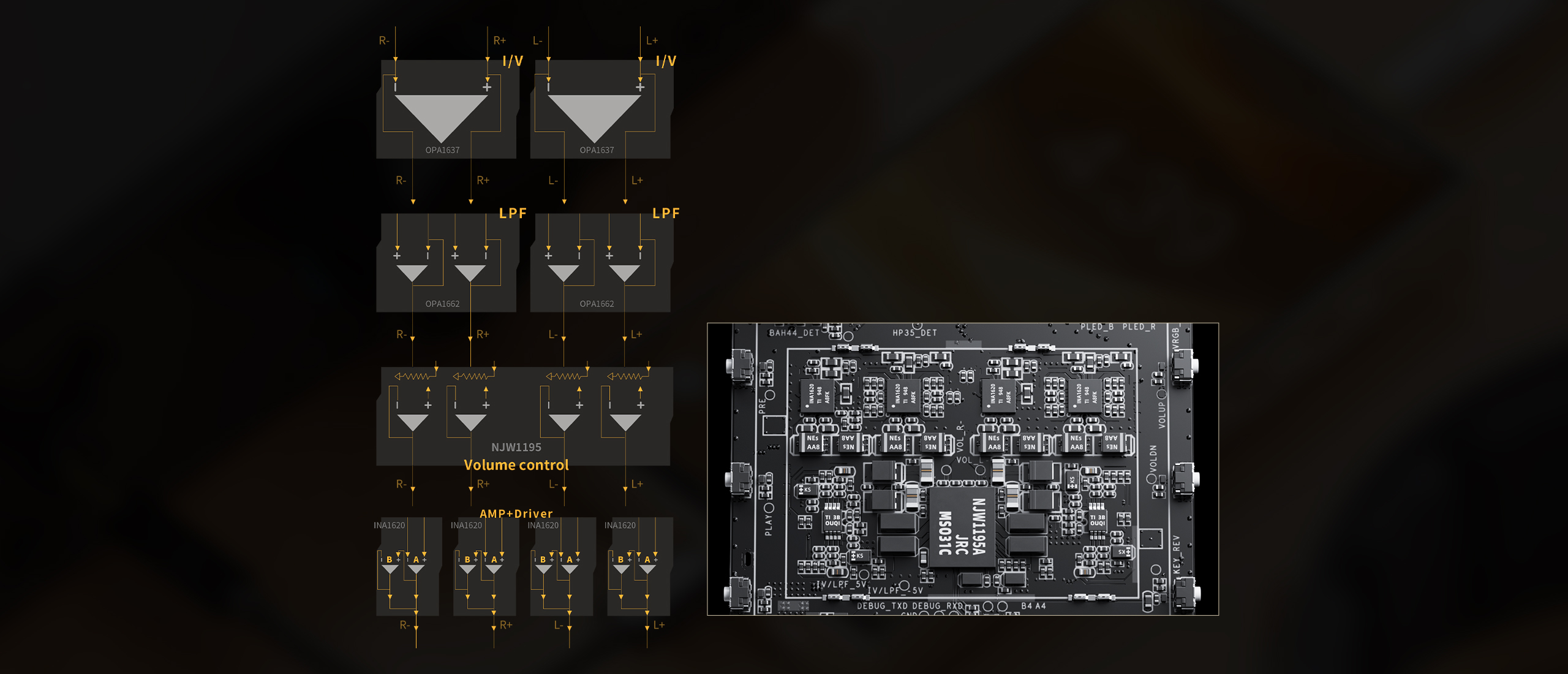 The pre-amp stage utilizes TI fully differential op-amps for I/V conversion and signal conditioning, delivering a natural and expansive soundstage. The output stage features quad INA1620 amp chips in a parallel configuration. Thanks to these chips, the result is output power up to 1100mW+1100mW to effortlessly drive any headphone. Finally, the precision electronic volume control ensures that you experience explosive dynamics without losing a hint of detail.