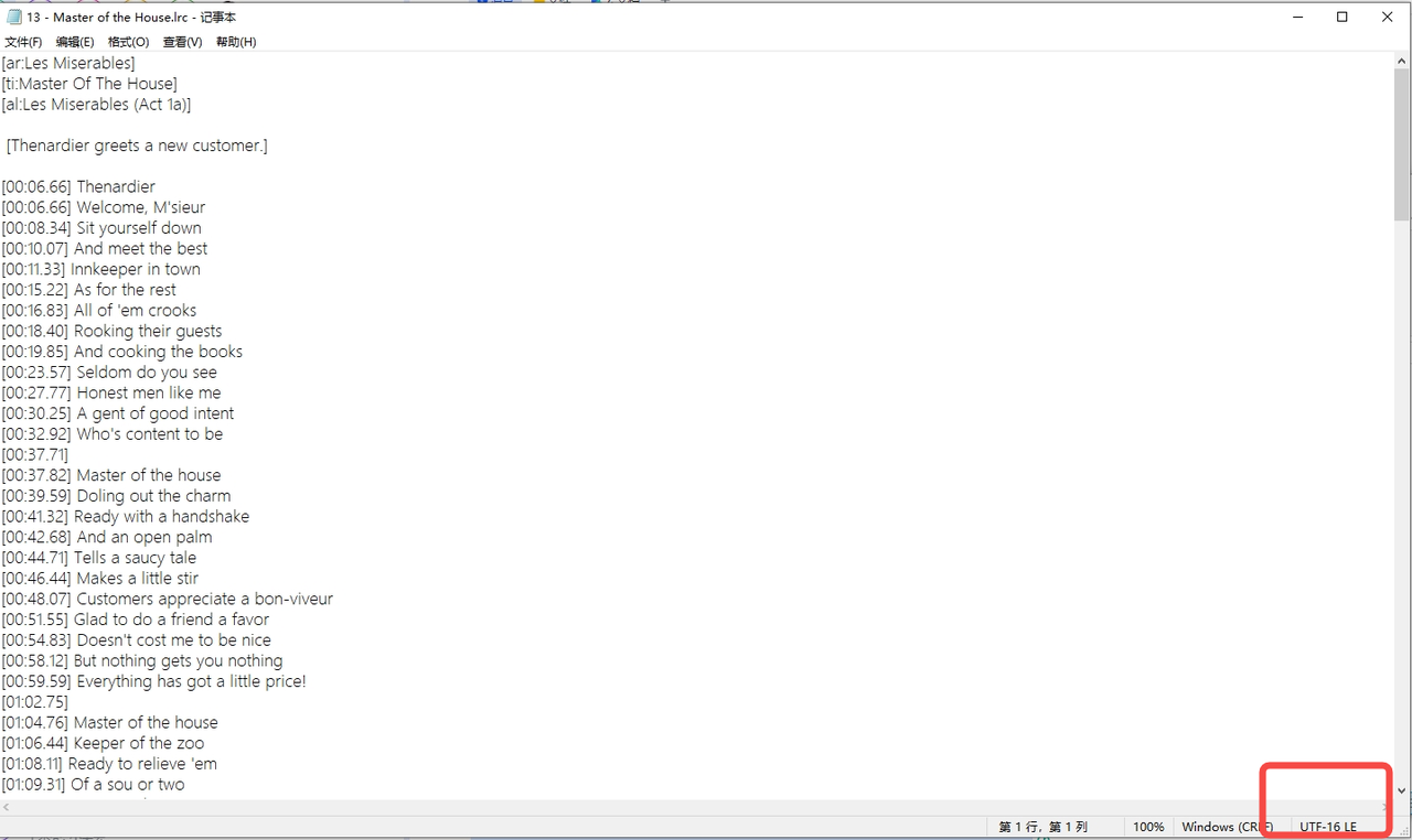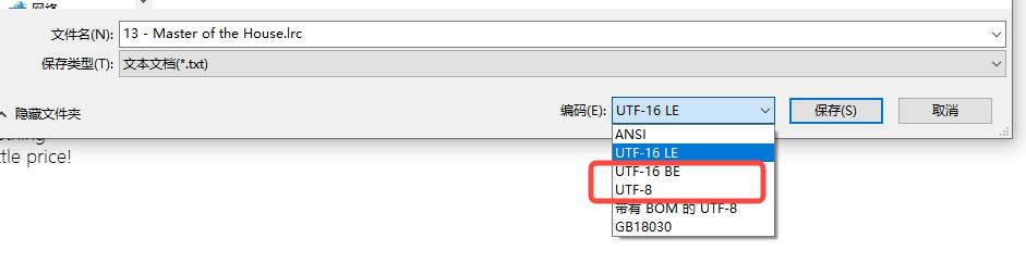3.Confirm that the encoding format is correct. LRC files support UTF-8 or ANSI encoding, but do not support UTF-16 encoding.