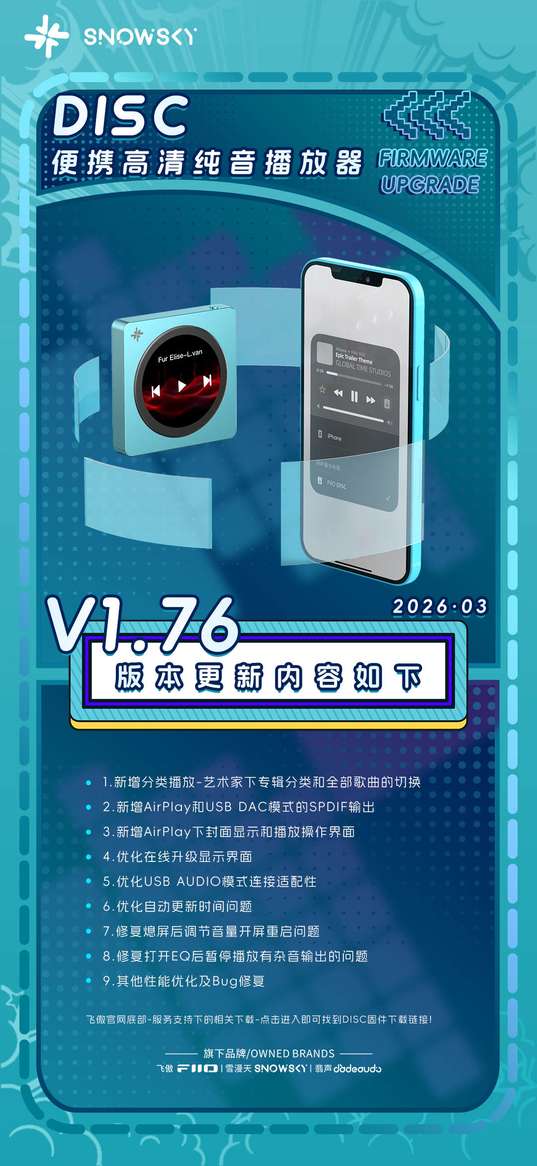 雪漫天纯音播放器DISC固件更新,新增AirPlay下封面显示等多个功能!