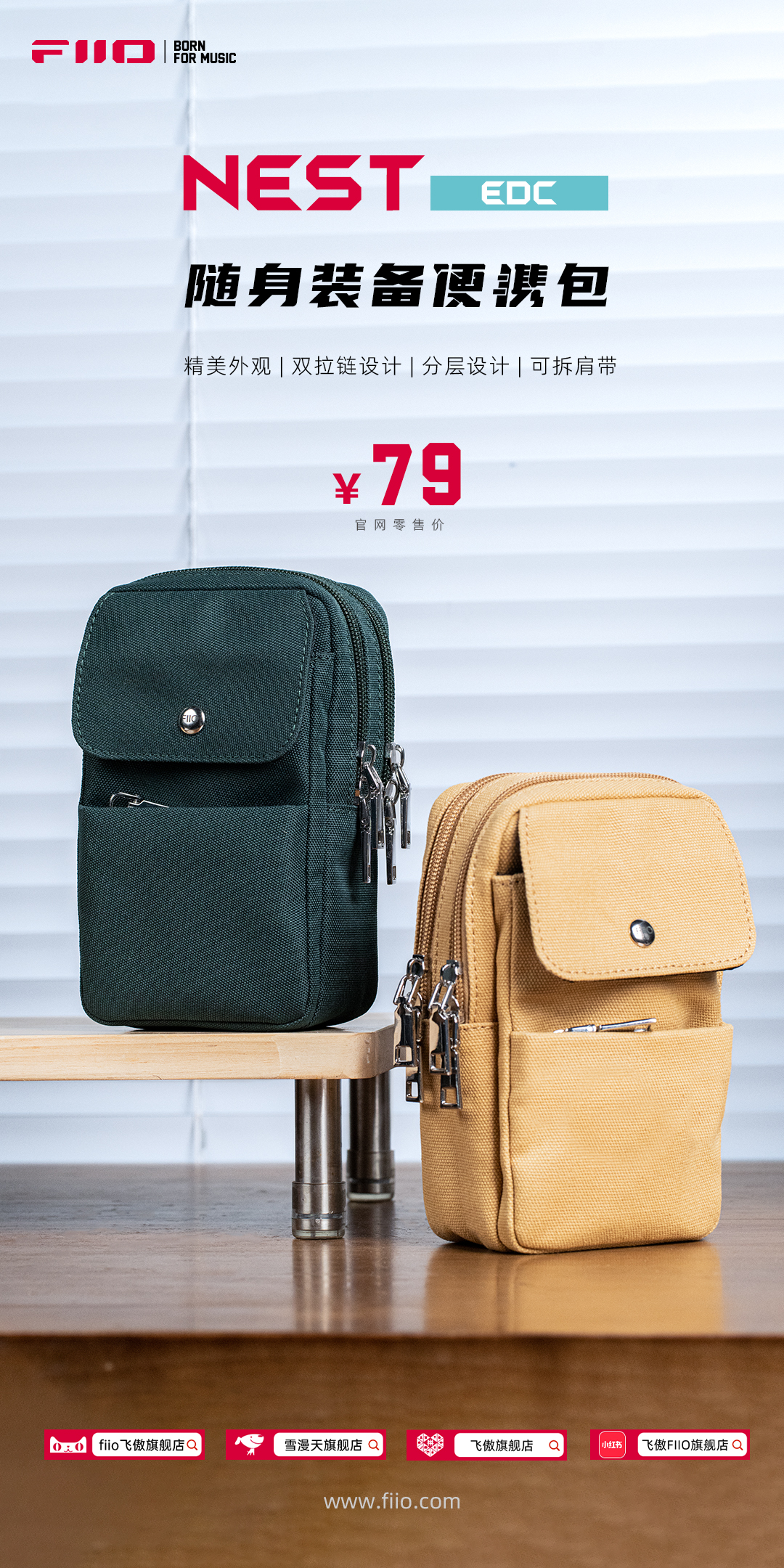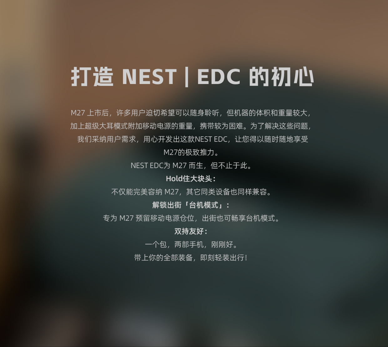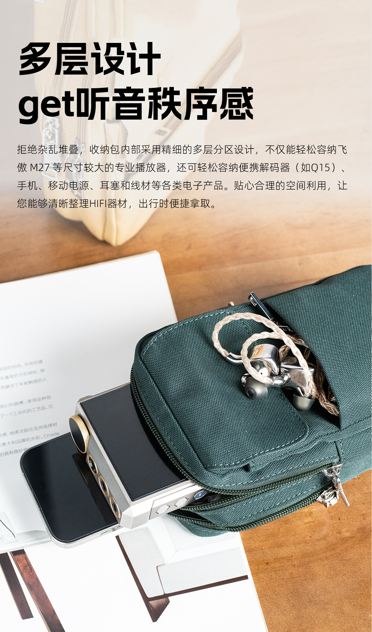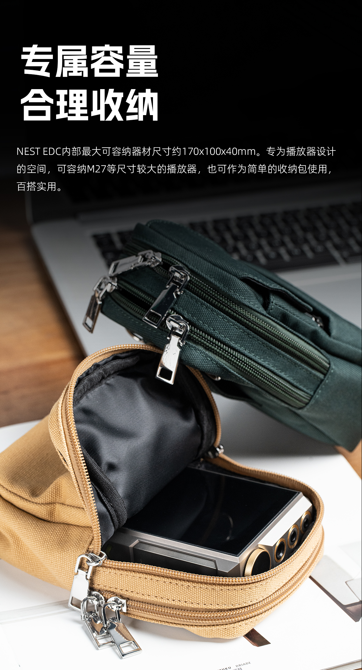 NEST系列全新产品:NEST EDC | 鸟巢 随身装备便携包现正式上市!这款收纳包,因M27而生。在M27 上市后,很多用户有随身聆听的需求,但因机器以及超级大耳模式附带移动电源重量的限制,实现比较困难。因此,飞傲采纳用户需求,悉心推出这款NEST EDC,让您得以轻松携带您的M27出行畅听。