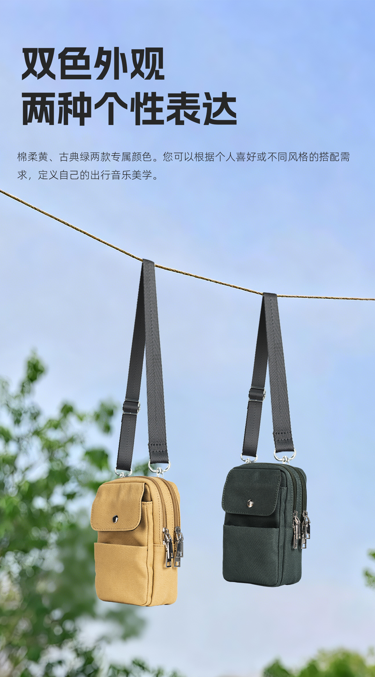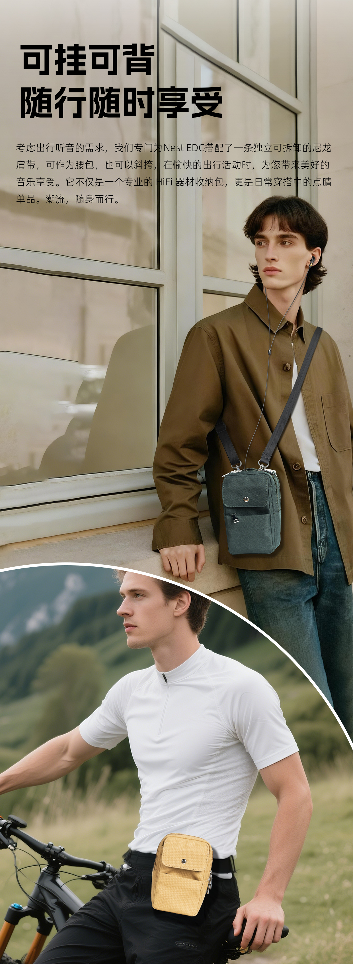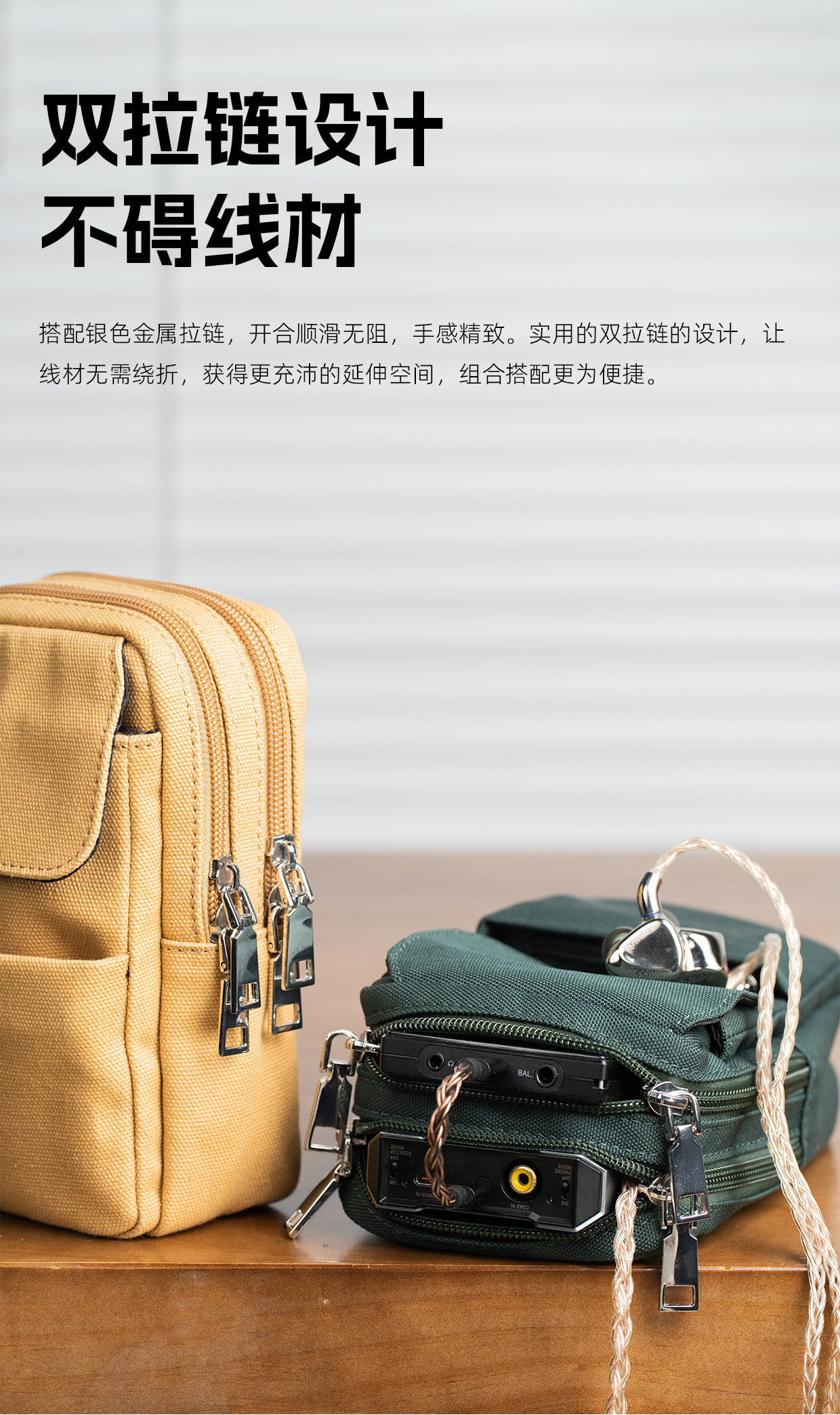 这款收纳包有黄、绿两种不同颜色,黄色采用全棉面布搭配涤纶内衬,绿色内外均采用高品质涤纶布料,提供不同的风格和需求的选项。多层分区设计,安排合理,每层可分别容纳多种尺寸的便携播放器(如M27)、便携解码器(如Q15)、耳塞、线材、手机和移动电源。双拉链设计,从容应对不同接口位置,让线材能够无需绕折地直行伸出。挂/背皆可,配备一条独立可拆的尼龙肩带,可以是腰包,也可以是斜挎包,为您愉快的出行听音活动,增添更丰富的体验感。