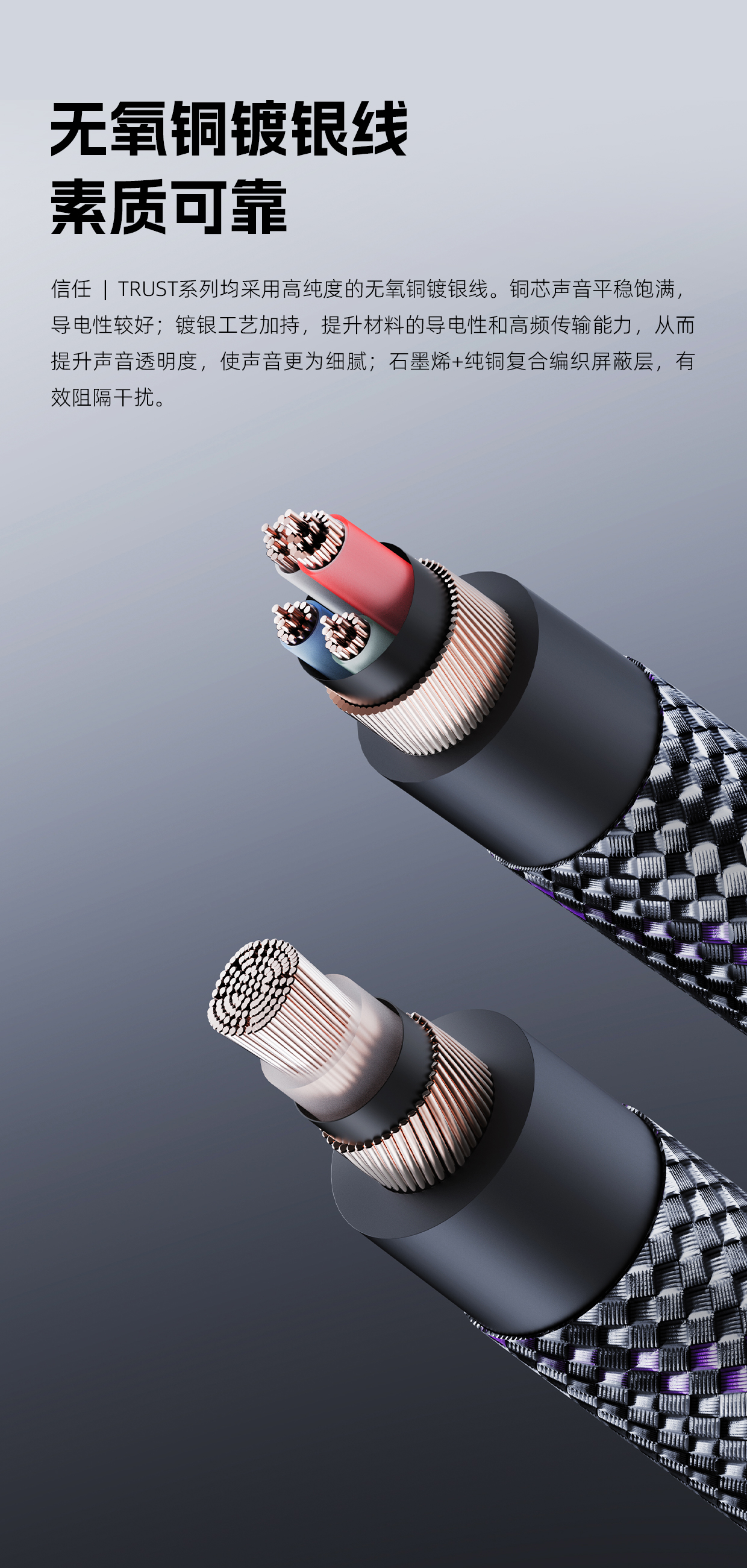 无氧铜镀银线: 均采用高纯度无氧铜镀银线芯,辅以石墨烯+纯铜复合编织屏蔽层,声音细腻。