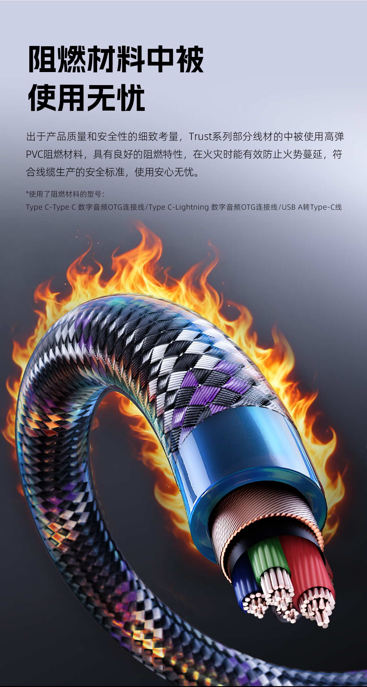 阻燃材料中被: 部分线材中被采用高弹PVC阻燃材料,符合线缆安全生产标准,有效防止火势蔓延,使用更安心。