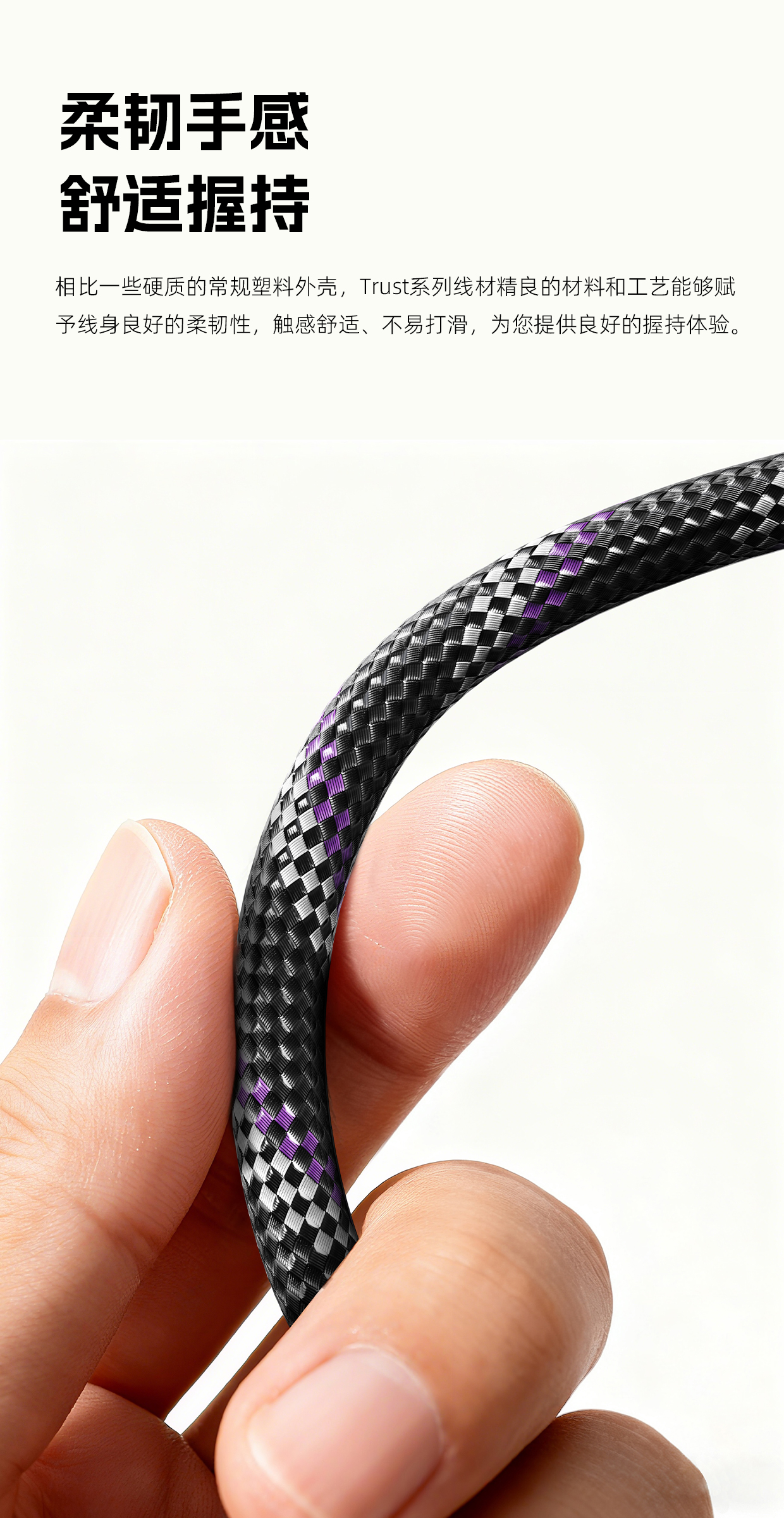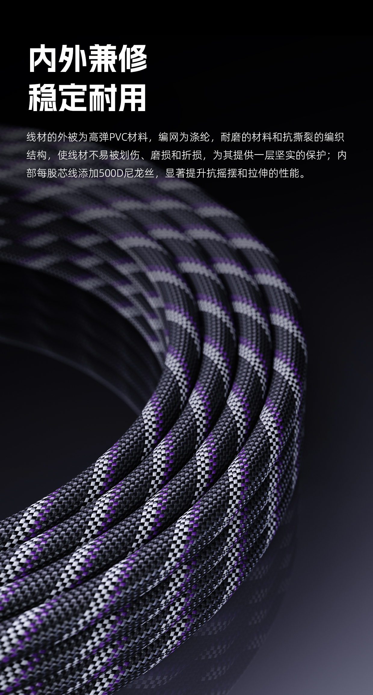 柔韧手感: 精良材料赋予线身良好的柔韧性,触感舒适且不易打滑,握持体验舒适。