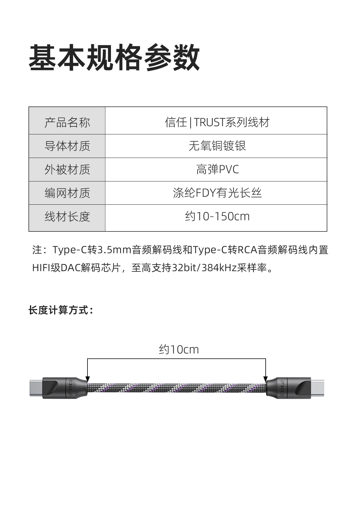 专业DAC芯片: Type-C转3.5mm、Type-C转RCA款内置HIFI级DAC解码芯片,至高支持32bit/384kHz采样率。