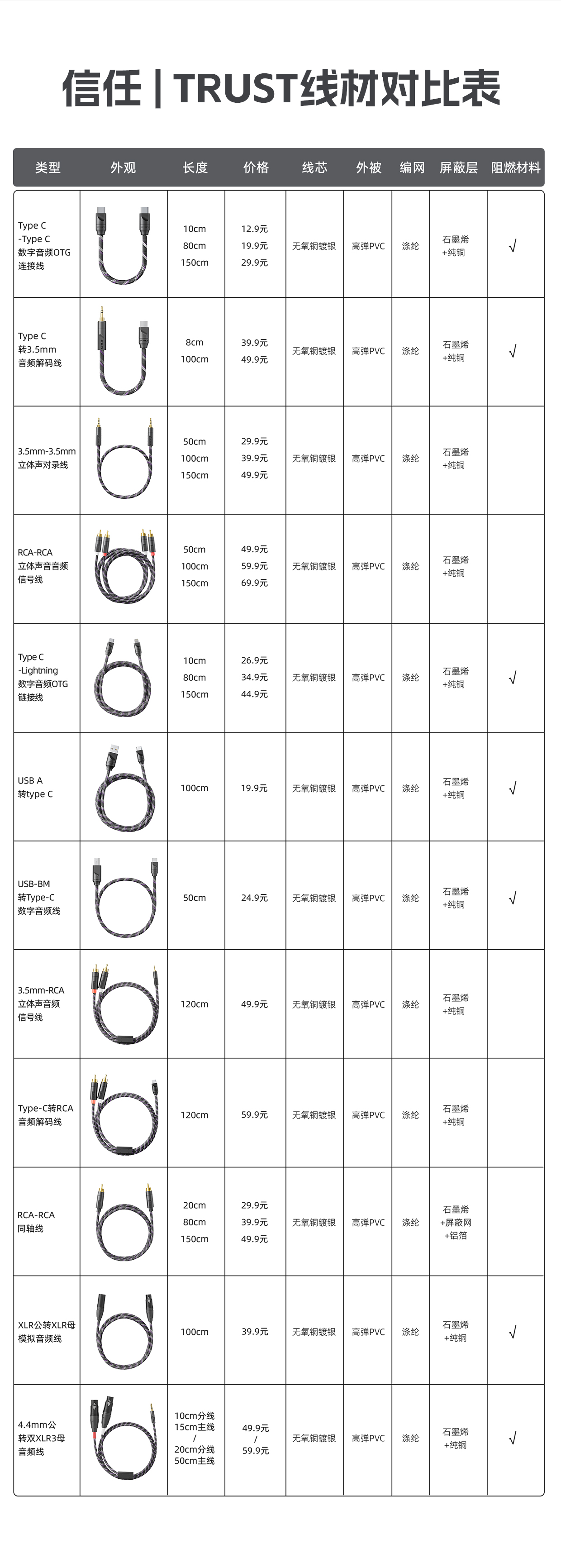 “信任”是TRUST的含义,我们希望以良好的出品,为消费者提供“放心之选”。此次上新的产品,包括Type C转3.5mm音频解码线、USB-B转Type-C数字音频线、XLR公转XLR母模拟音频线和4.4公转双XLR3母音频线,价格分别为39.9/49.9元、24.9元、39.9元、49.9/59.9元。其中Type-C转3.5mm音频解码线和Type-C转RCA音频解码线内置HIFI级DAC解码芯片,至高支持32bit/384kHz采样率,提供优秀的声音素质。TRUST系列线材官方售价12.9元起,欢迎大家选购!