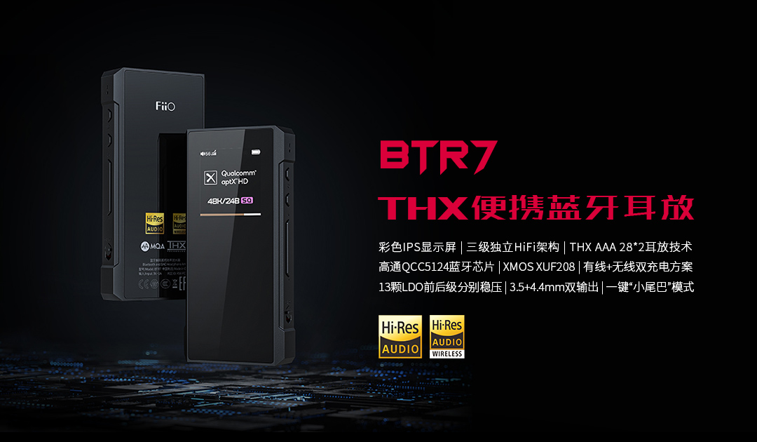 3、THX便携蓝牙耳放 BTR7(彩色IPS显示屏,高性能DAC+低通滤波器+THX耳放架构,高通QCC5124蓝牙芯片,XMOS XUF208,有线+无线双充电方案,3.5+4.4mm双输出)