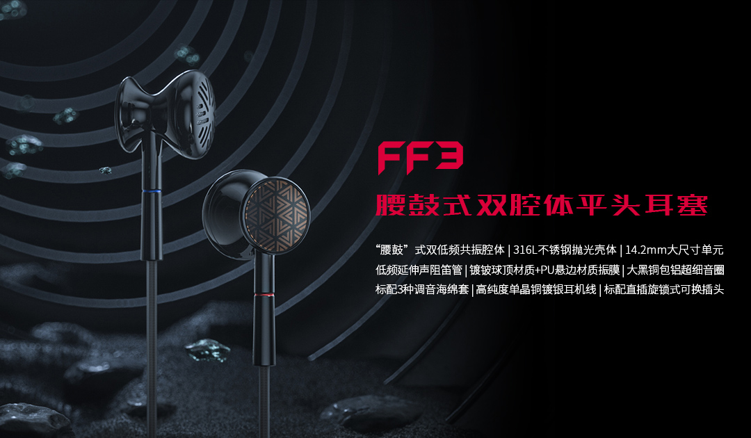 1、腰鼓双腔体平头耳塞 FF3(316L不锈钢抛光壳体,低频延伸声阻笛管设计,14.2mm大尺寸单元,镀铍球顶材质+PU悬边材质振膜,标配直插旋锁式可换插头)