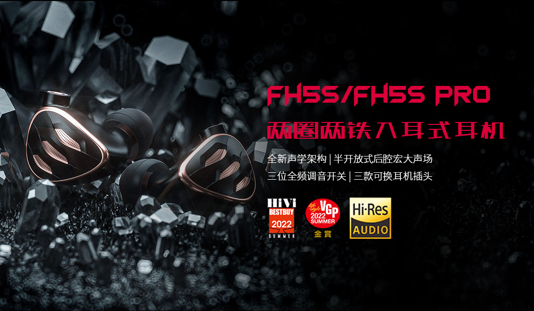 4、两圈两铁入耳式耳机 FH5s/FH5s Pro(荣获VGP 2022 SUMMER受赏、日本HIVI BEST BUY 2021 SUMMER大奖、IBTimes(国际财经时报)的“五星推荐奖”,采用两圈两铁全新声学架构,三位全频调音开关,三款可换耳机插头)