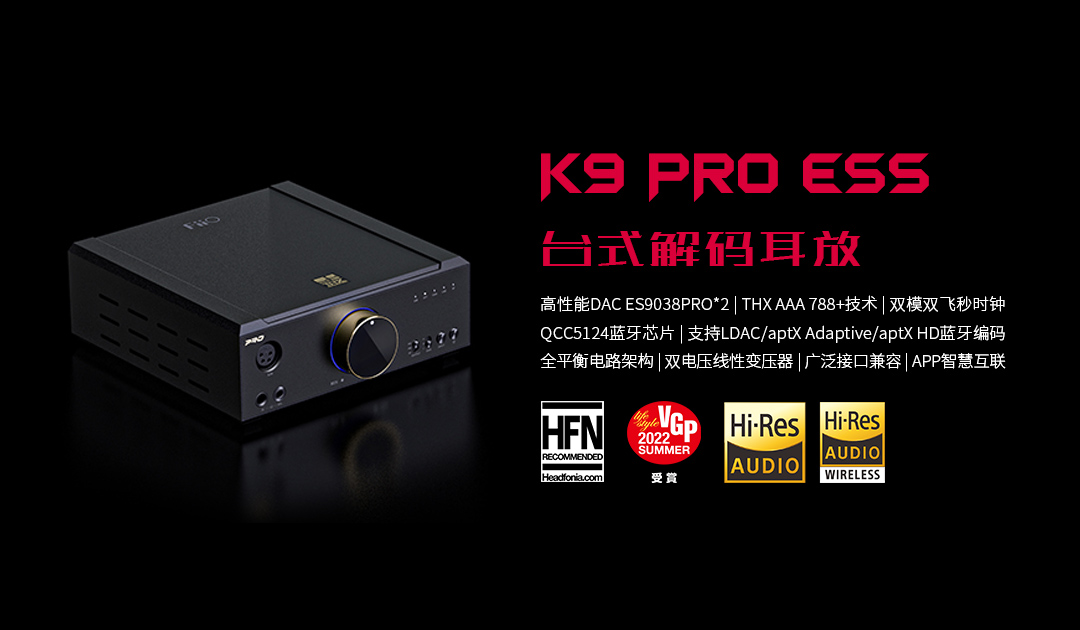 1、台式解码耳放 K9 Pro ESS(荣获《Headfonia》的 Recommend Buy Award、2022 VGP SUMMER 受赏、IB Times(国际财经时报)五星推荐,配置两颗ES9038PRO高性能芯片,THX-AAA 788+技术,双模时钟管理技术,双电压线性变压器,支持展开MQA的曲目,支持LDAC/aptX Adaptive等高清蓝牙解码)