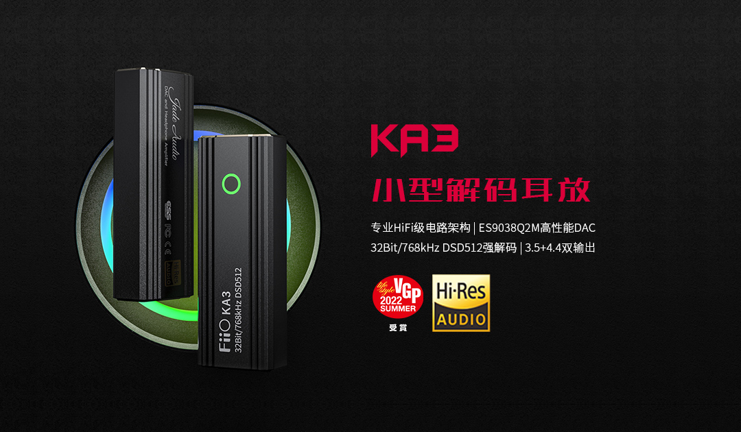 7、小型解码耳放 KA3(荣获2022 VGP SUMMER 受赏,采用独立DAC ES9038Q2M,专业的电路架构,支持3.5/4.4mm双输出接口,智能APP联控)