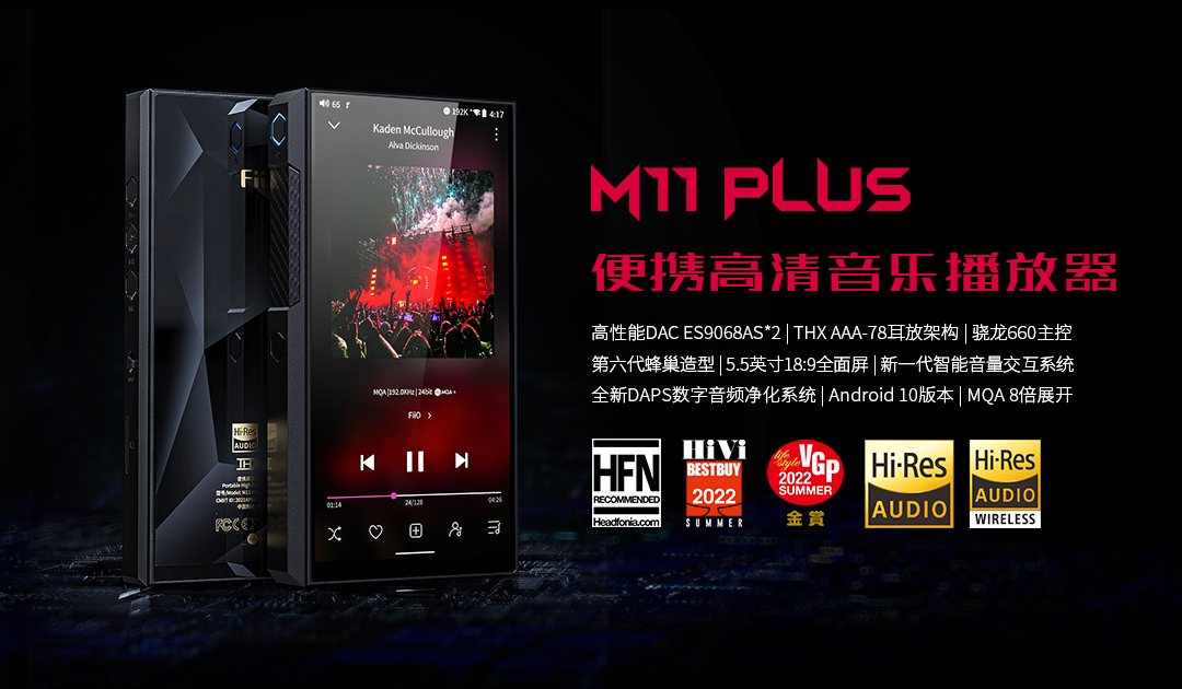 2、便携高清音乐播放器 M11 Plus(荣获《Headfonia》的 Recommend Buy Award、2022 VGP SUMMER 金奖、HiVi Summer Best Buy 2022金奖,搭载两颗ES9068AS高性能芯片,高端THX AAA-78耳放架构,骁龙660主控,5.5英寸18:9全面屏,Android10版本)