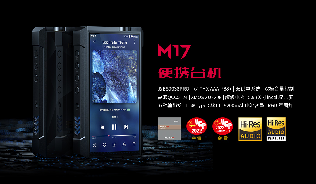 1、便携台机 M17(荣获ZOL GG100百大卓越科技产品奖、IBTimes国际财经时报Best Product、VGP 2022金赏、VGP 2022 SUMMER 金奖,采用台机级别的双ES9038PRO旗舰芯片、THX 788+耳放技术,5.99英寸18:9 FHD+显示屏,双供电系统)