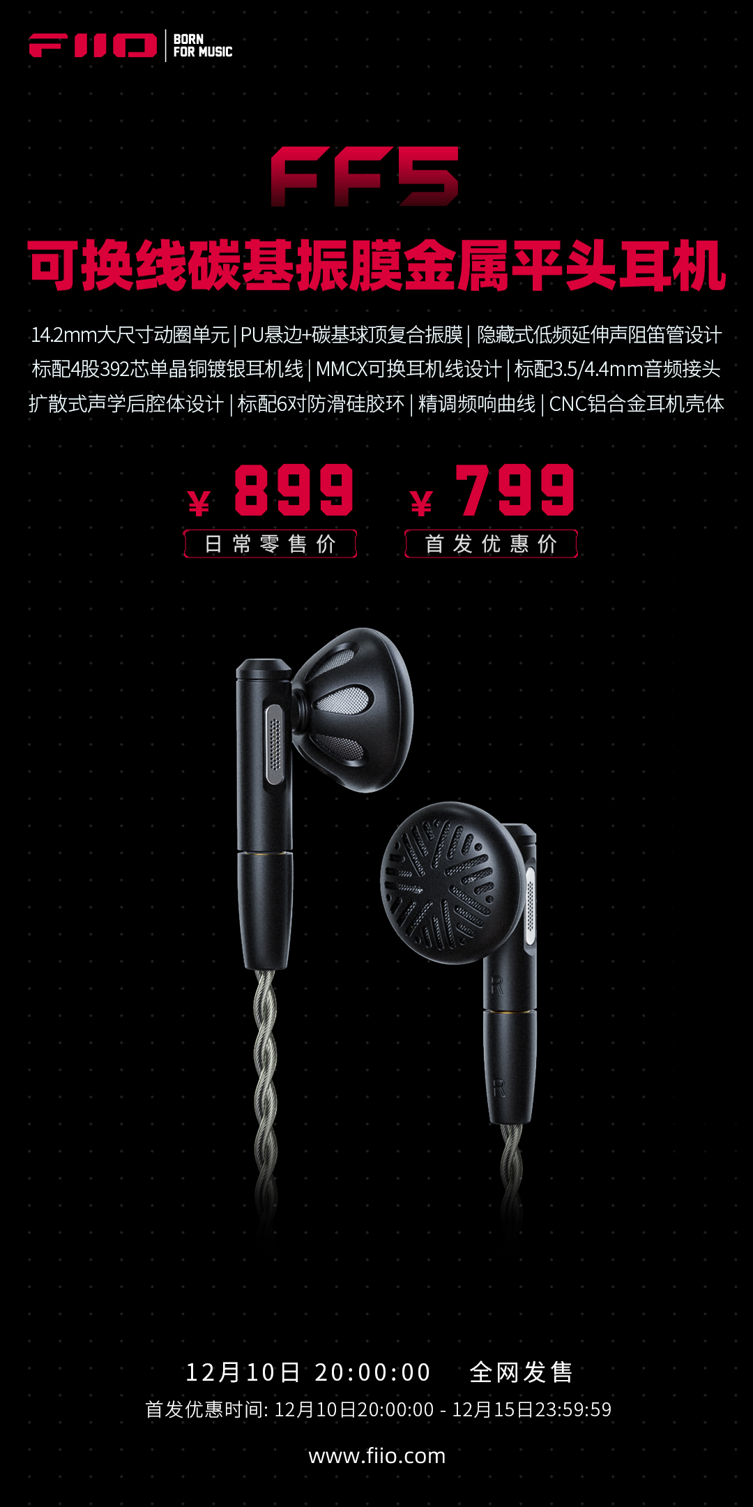 飞傲一直坚持“以用户为导向”,特别是平头耳机,作为“必烧“类型,声学团队从未停止过对它的创新与探索,如今,第五代平头耳机FF5完成华丽蜕变,带着满满的诚意与前沿的声学技术,搭载更轻更快的碳基振膜,极速而至,让我们为HiFi欢呼,见证这一场听觉盛宴。