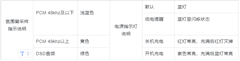Q11机身中间的氛围灯窗和电源指示灯各可以显示3种颜色,对应当前播放曲目的采样率以及电池电量的模式如下表。当播放的曲目与氛围灯窗的颜色不对应时,请注意,一定不是Q11损坏。请检查播放设备或软件设置是否正确,检查是否有SRC处理。