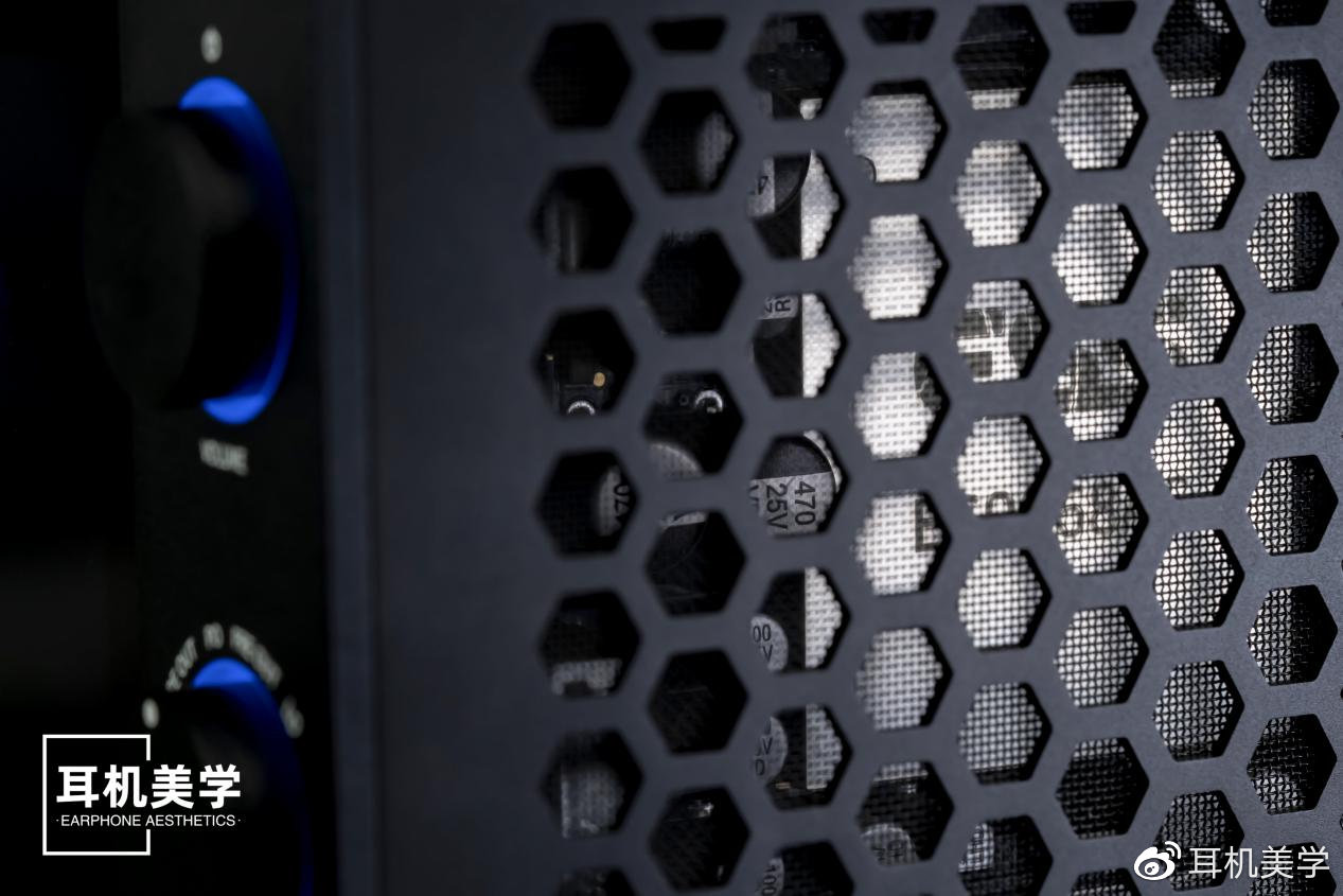飞傲甚至还效仿时下流行的侧透式机箱,把R7的侧边边板也弄成了蜂窝状的半透明结构。透过金属网,可以隐约观察到R7的音频主板与电源系统。工整的元器件布局与电路板走线令其好感度倍增。电源一侧多颗硕大的电容与显眼的环形变压器。同样表明这是一部正儿八经的台式播放器。