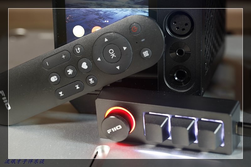 现在再看一下桌面生态的版图,有了坐镇的台式音源和放大器,有了大耳机,还有了可便携可桌面的大推力DAP,你觉得桌面玩家还缺啥?没错,飞傲的第四款其实已经在我的桌上了,那就是桌面有源音箱,不过箱子是需要比耳机更长的煲机时间的,所以放在以后再谈,文末要提及的是,飞傲还出了两个小玩具,一个是带空鼠功能的蓝牙遥控器RM3,另一个是带音量旋钮的遥控小键盘KB1K,这两款产品不是特别型号的适配款,而是可以应用于绝大多数采用win/安卓/IOS智能系统的机型,我个人是将蓝牙遥控器和R7捆绑起来操作,避免了经常用手指点屏幕的麻烦,而KB1K,不但可以用于控制,还可以像普通机械键盘那样更换轴体和键帽,可玩性很高,我在平板、手机、播放器和电脑上都试过,除了听音乐,看电影的软件也可以用,感觉一切带有进度条的软件都可以尝试,至于具体怎么玩可以更出彩,相信玩家们会比我更有想象力。