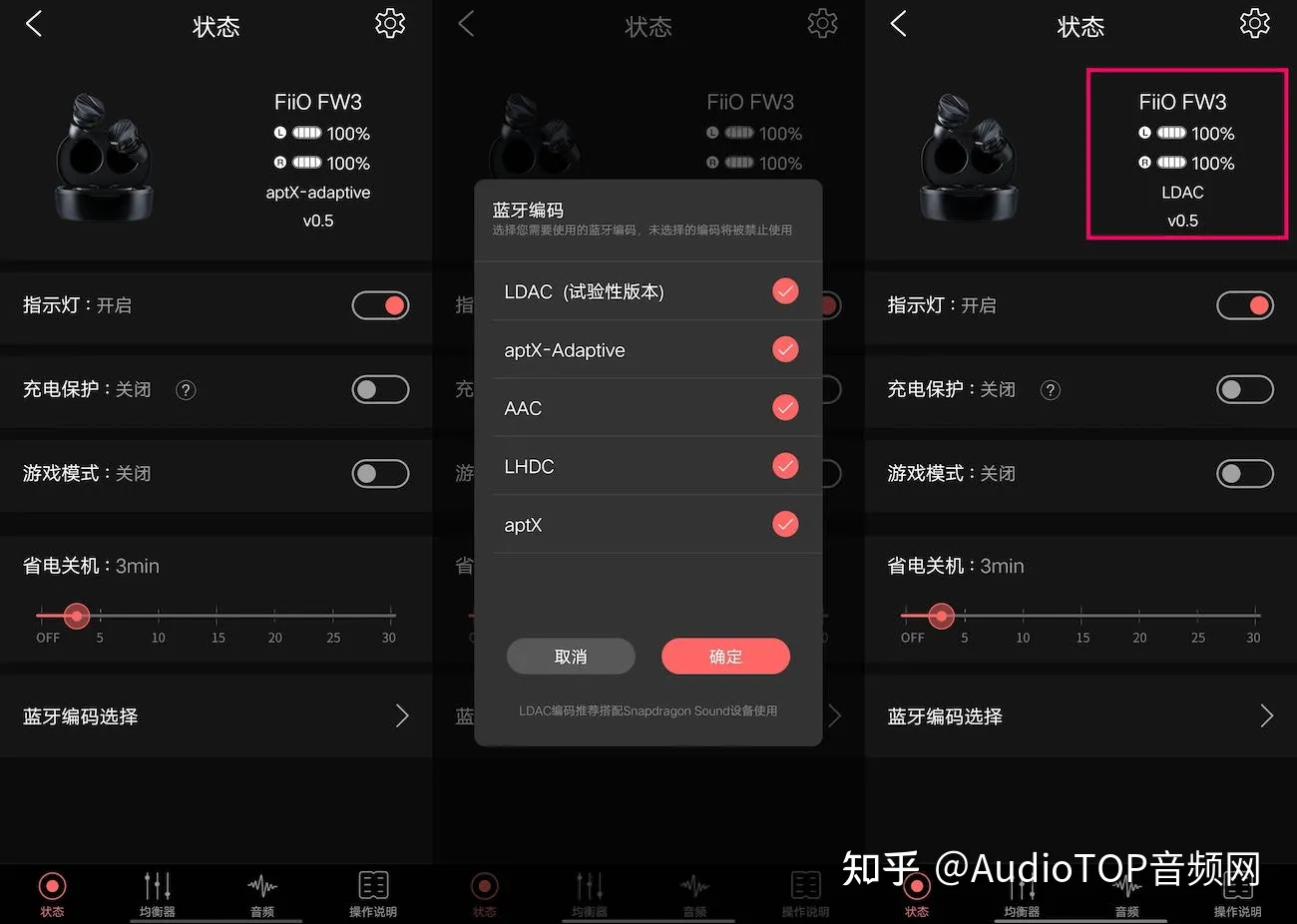在上图的右上角耳机状态区域中,电量的下面就是已连接的编码器名称了。可以看到FW3已经从aptX-adaptive切换到了LDAC。