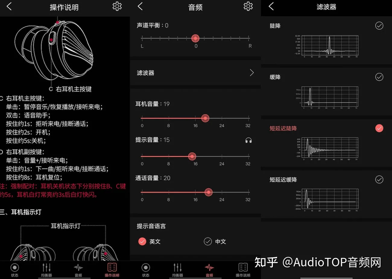 实体键只能算基本常规操作,FiiO Control APP的丰富和硬核程度令人三观震颤。 在「音频」选项卡中,有多个细分的音量设置可调。另外,AKM AK4332自带的4个滤波器曲线可选。说实话我是第一次看到TWS耳机可以调节DAC的滤波器。