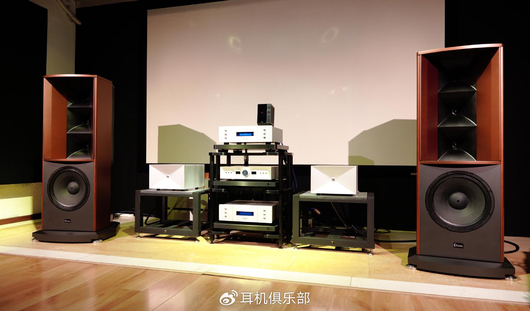 于是我来到了鑫星光音响二楼听音室,这里有一对15寸低音三个号角阵列组成中高音的意大利CASTA 的旗舰音箱elletra,前端是整套的模范,模范CD,模范前级,模范后级,这几天新到货的是模范后级MP1000,单声道1000W的功率,十分惊人,比以前的250W的表现更好,我拿来听的那天刚好接上调好,顺便就试了试。这套近百万的系统,够大了吧。R7这次再放在器材架上更显得孤单小巧,用银彩的信号线接到前级上,继续QQ音乐。