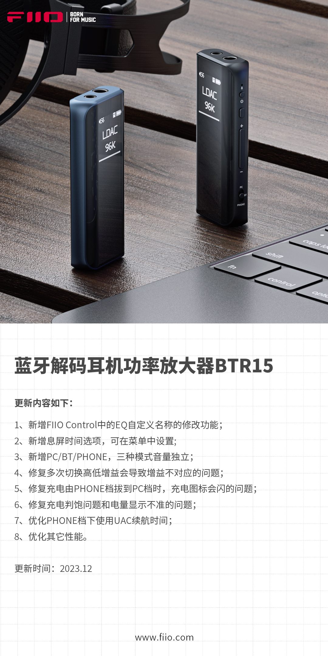 便携蓝牙解码耳放BTR15固件更新,新增EQ名称自定义,三种模式音量独立等功能。