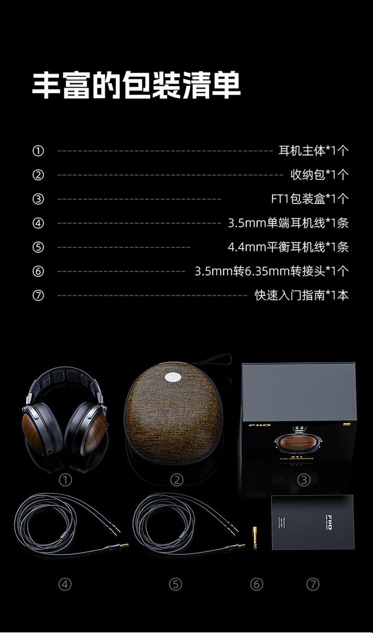 FT1的配件:收纳包1个、3.5mm插头单端线材1条,4.4插头平衡线1个,6.35公转3.5mm母转接头1个。