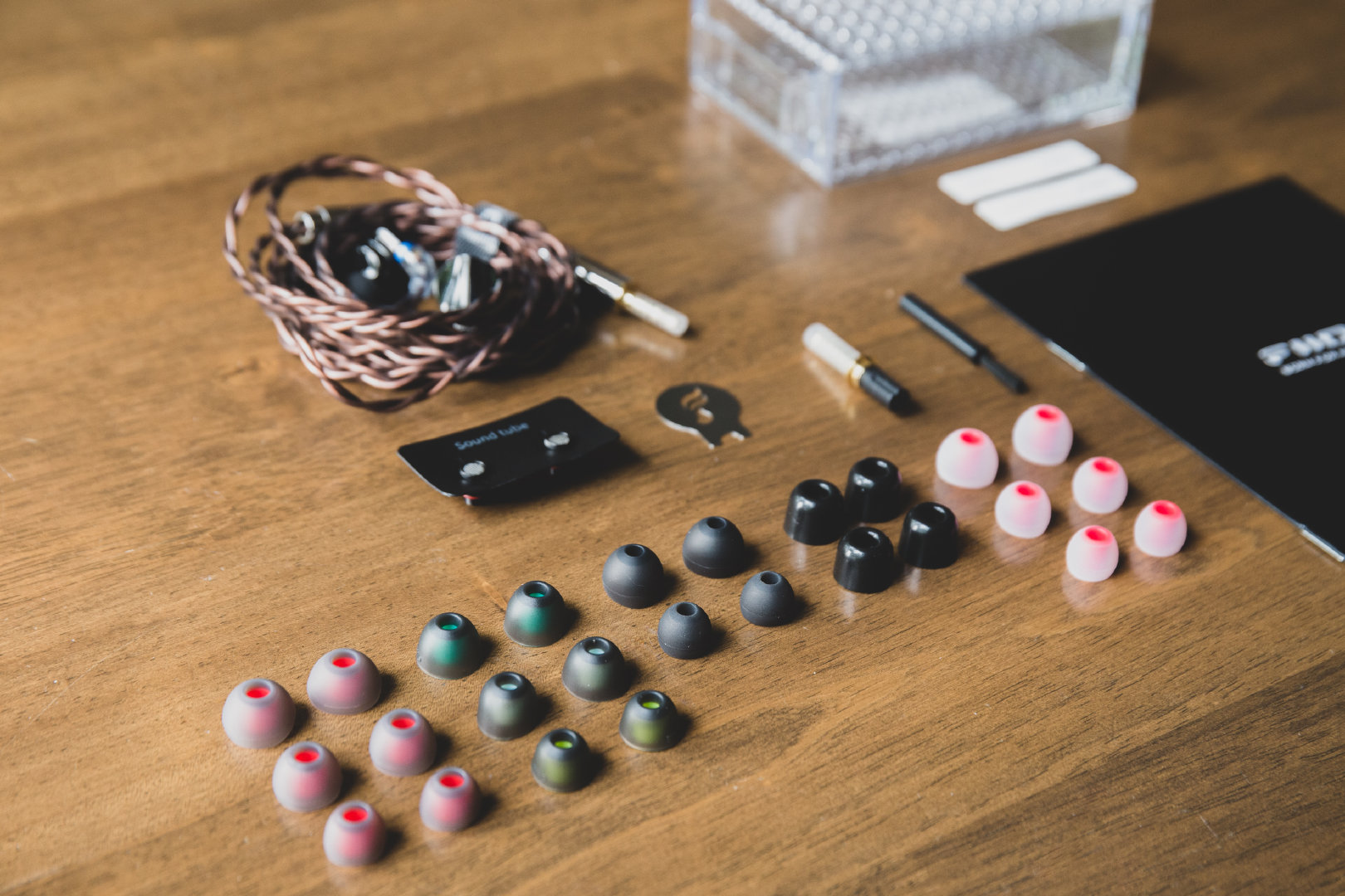在配件上一直走务实路线的飞傲,这次为飞傲 FD15 准备了一套「豪华」配件阵容,⽿机主体、⽿机线 1 条、均衡套 S/M/L号 3 对(M 号出⼚装在⽿机上)、⼈声套 S/M/L号 3 对、低频套 S/M/L 号 3 对、记忆海绵套 M 号 2 对、HS18 ⽿套 S/M/L 号3对、收纳盒 HB11、MMCX 快拆辅助器 × 1 个、清洁⼩⽑刷 1 个、3.5/4.4mm 可换插头 1 个、红⾊/⿊⾊可换声导管 2 对、快速⼊⻔指南 1 本,这款耳机多达 14 对耳套,很不让人眼花缭乱。