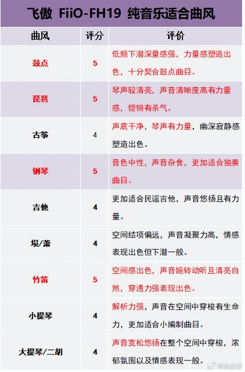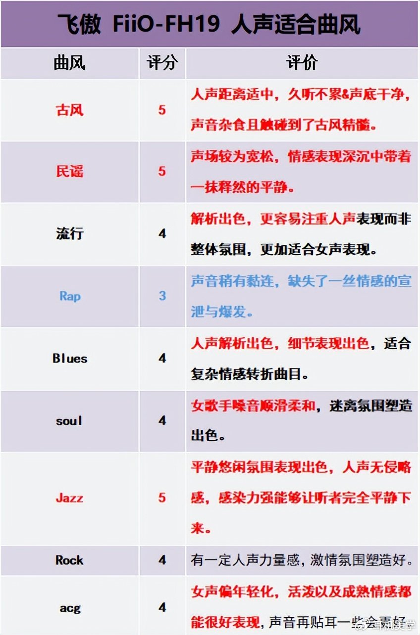 声音体验:该部分较为复杂,是我做出上文声音总结的依据,不想浪费时间的可以跳过,我已经将不同曲风下的声音特色用一句话描述制成了表格,看表格就能大致了解该耳机的具体声音风格啦。