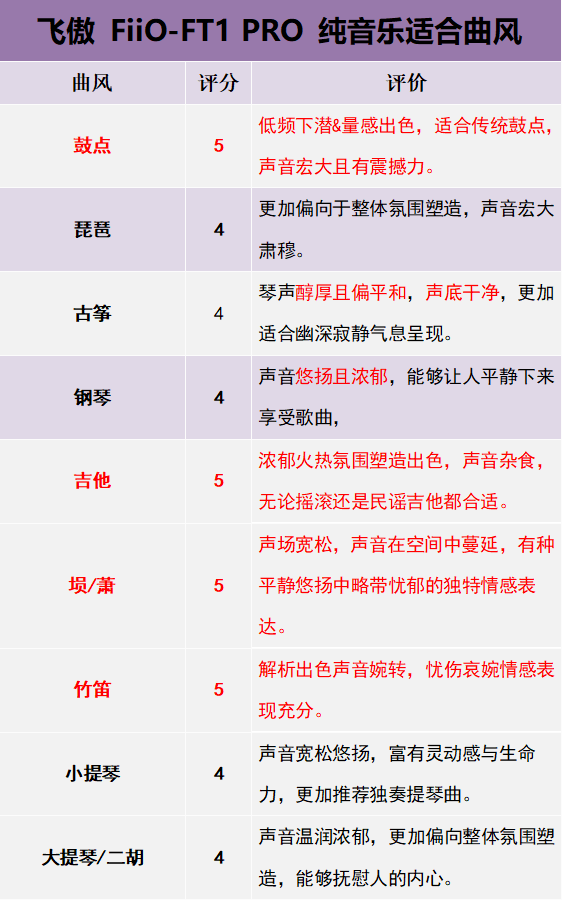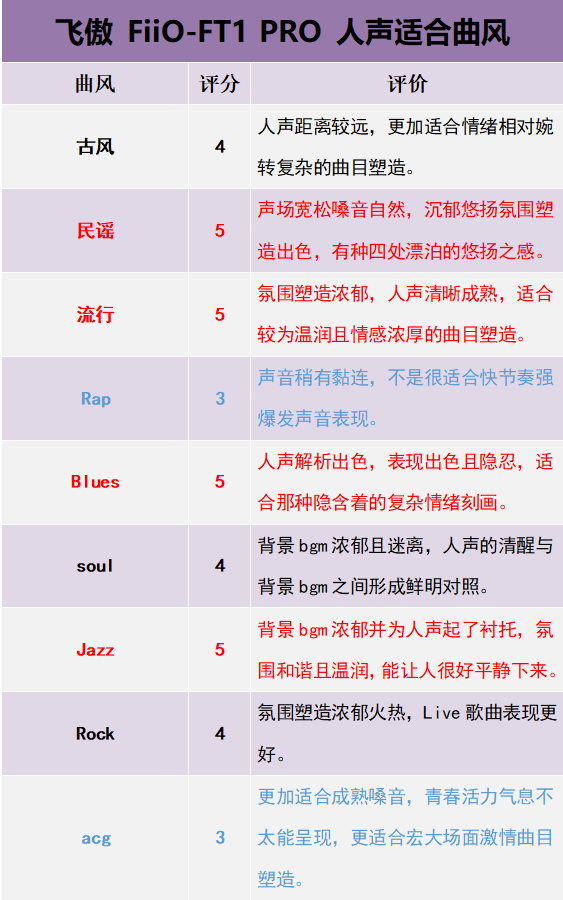 声音体验:该部分较为复杂,是我做出上文声音总结的依据,不想浪费时间的可以跳过,我已经将不同曲风下的声音特色用一句话描述制成了表格,看表格就能大致了解该耳机的具体声音风格啦。